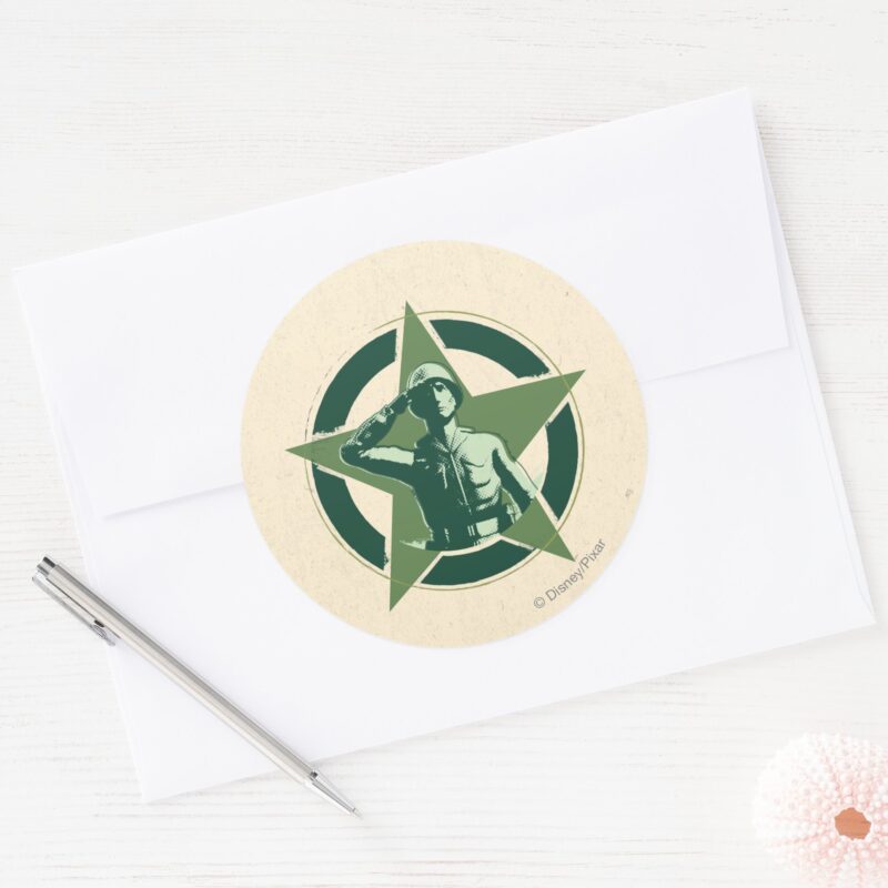 Army Sarge Salutes Classic Round Sticker vinyl sticker, waterproof durable collectible sticker for laptop, phone, bottle, bike, notebook, helmet, and accessories.