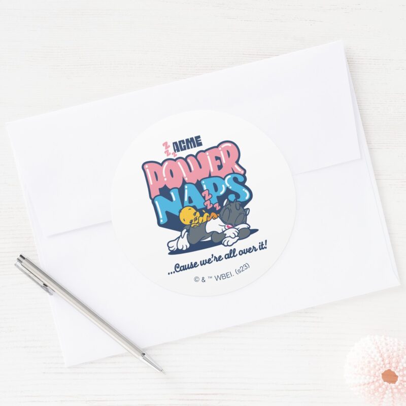 Baby TWEETY™ SYLVESTER™ Power Naps Classic Round Sticker vinyl sticker, waterproof durable collectible sticker for laptop, phone, bottle, bike, notebook, helmet, and accessories.