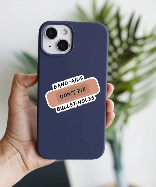 Band Aids Dont Fix Bullet Holes is designed to capture the personality, emotion, and visual appeal that make the design instantly recognizable and engaging. The artwork reflects the core essence of the character or concept, delivering a clear vibe that fans can connect with at first glance. Whether it represents nostalgia, humor, strength, cuteness, or attitude, Band Aids Dont Fix Bullet Holes feels expressive and meaningful rather than generic. This vinyl sticker comes with a clean transparent or white border that enhances the design while keeping it versatile for different surfaces. It adds personality to everyday items like laptops, phones, bottles, notebooks, bikes, helmets, and desks. The look is bold yet balanced, making it suitable for both collectors and casual fans. Band Aids Dont Fix Bullet Holes is made to stand out without overpowering its surroundings, acting as a small but impactful visual statement. The sticker is waterproof, scratch-resistant, and durable, ensuring long-lasting quality for indoor and outdoor use. Easy to apply and remove, it’s perfect for personalizing your space or gear. Whether you’re expressing fandom, mood, or style, Band Aids Dont Fix Bullet Holes works as a simple, high-quality sticker that adds character and visual interest wherever it’s placed.
