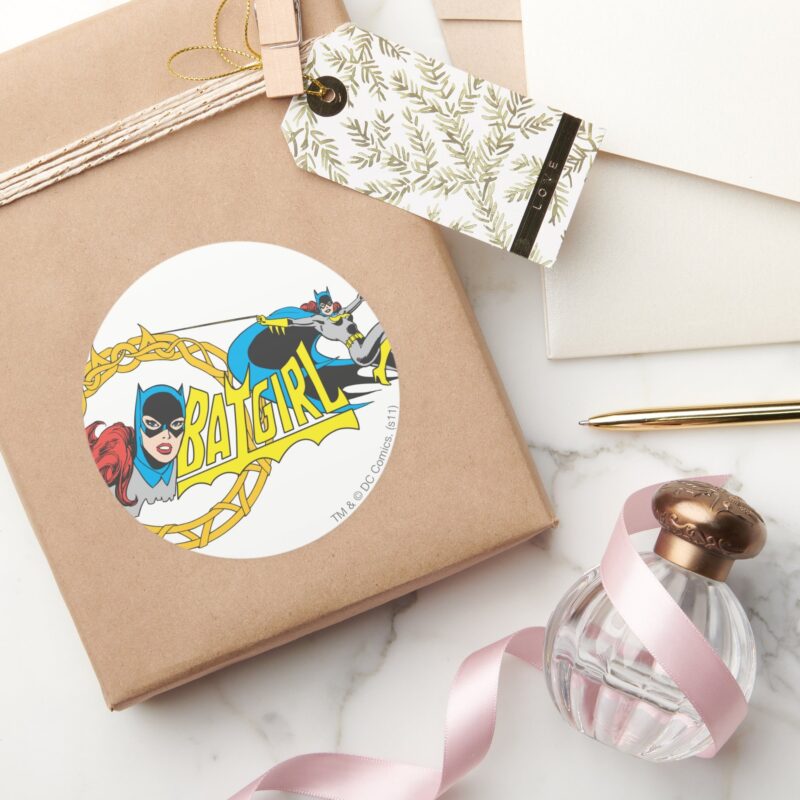 Batgirl Display Classic Round Sticker vinyl sticker, waterproof durable collectible sticker for laptop, phone, bottle, bike, notebook, helmet, and accessories.