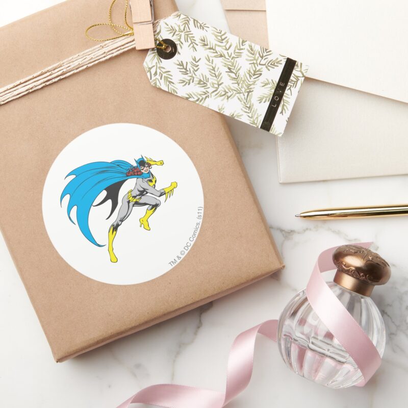 Batgirl Runs Classic Round Sticker vinyl sticker, waterproof durable collectible sticker for laptop, phone, bottle, bike, notebook, helmet, and accessories.