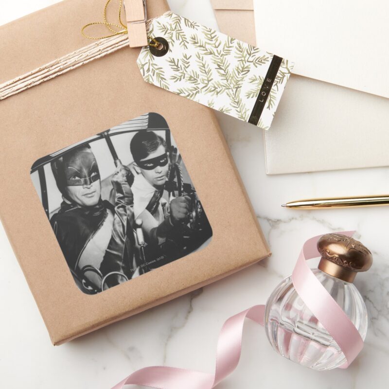 Batman And Robin In Batmobile Square Sticker vinyl sticker, waterproof durable collectible sticker for laptop, phone, bottle, bike, notebook, helmet, and accessories.