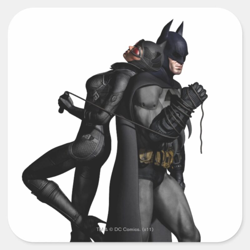 Batman Arkham City Batman And Catwoman Square Sticker vinyl sticker, waterproof durable collectible sticker for laptop, phone, bottle, bike, notebook, helmet, and accessories.