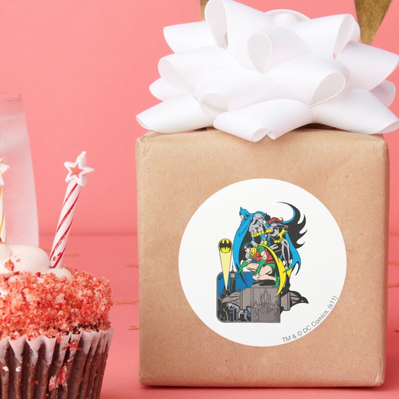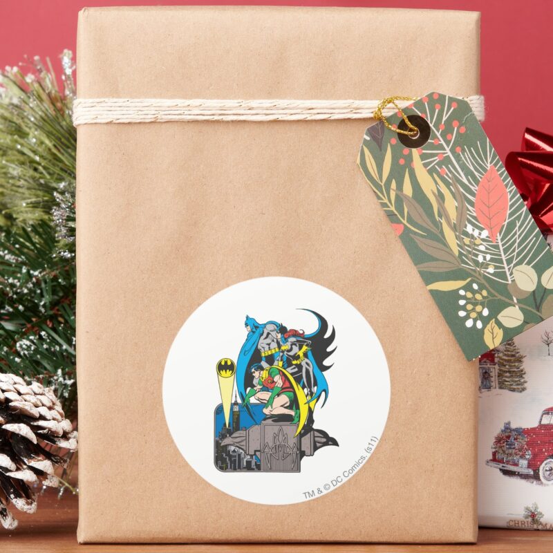 Batman Batgirl Robin Classic Round Sticker vinyl sticker, waterproof durable collectible sticker for laptop, phone, bottle, bike, notebook, helmet, and accessories.