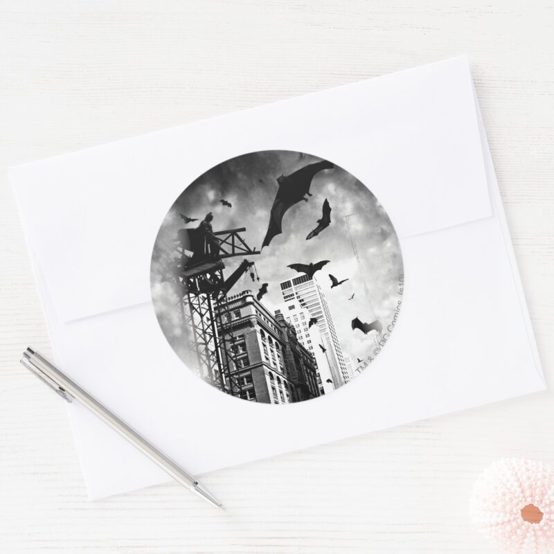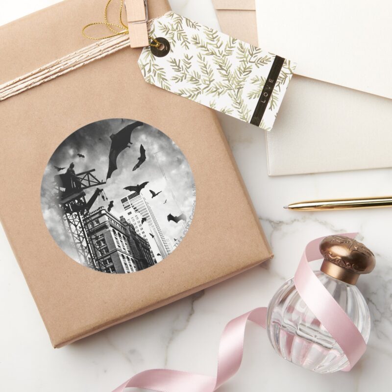 Batman Bats Flying Through Gotham Classic Round Sticker vinyl sticker, waterproof durable collectible sticker for laptop, phone, bottle, bike, notebook, helmet, and accessories.