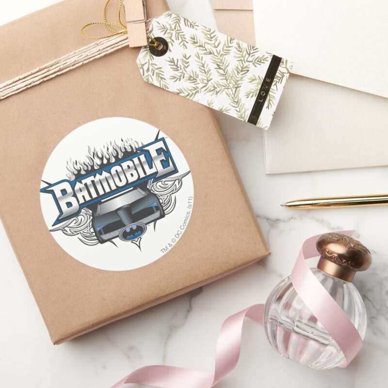 Batman Car And Flames Classic Round Sticker vinyl sticker, waterproof durable collectible sticker for laptop, phone, bottle, bike, notebook, helmet, and accessories.