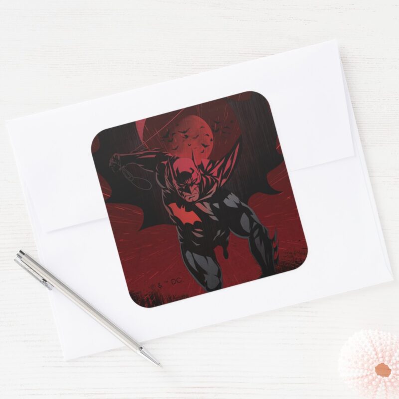 Batman Crimson Leap Square Sticker vinyl sticker, waterproof durable collectible sticker for laptop, phone, bottle, bike, notebook, helmet, and accessories.