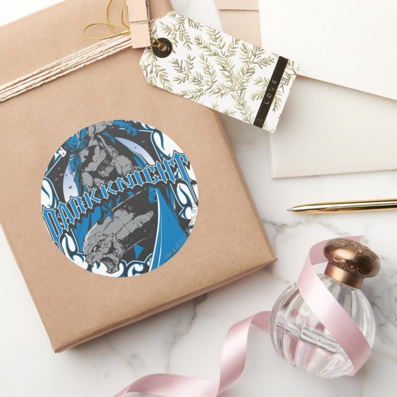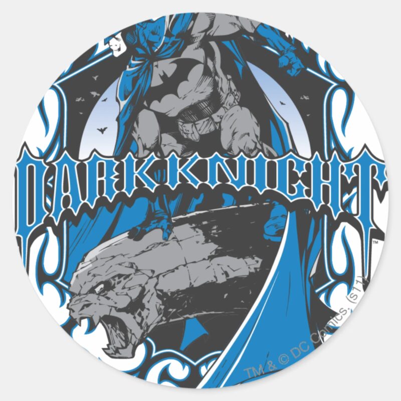 Batman Dark Knight Blue Grey Logo Classic Round Sticker vinyl sticker, waterproof durable collectible sticker for laptop, phone, bottle, bike, notebook, helmet, and accessories.