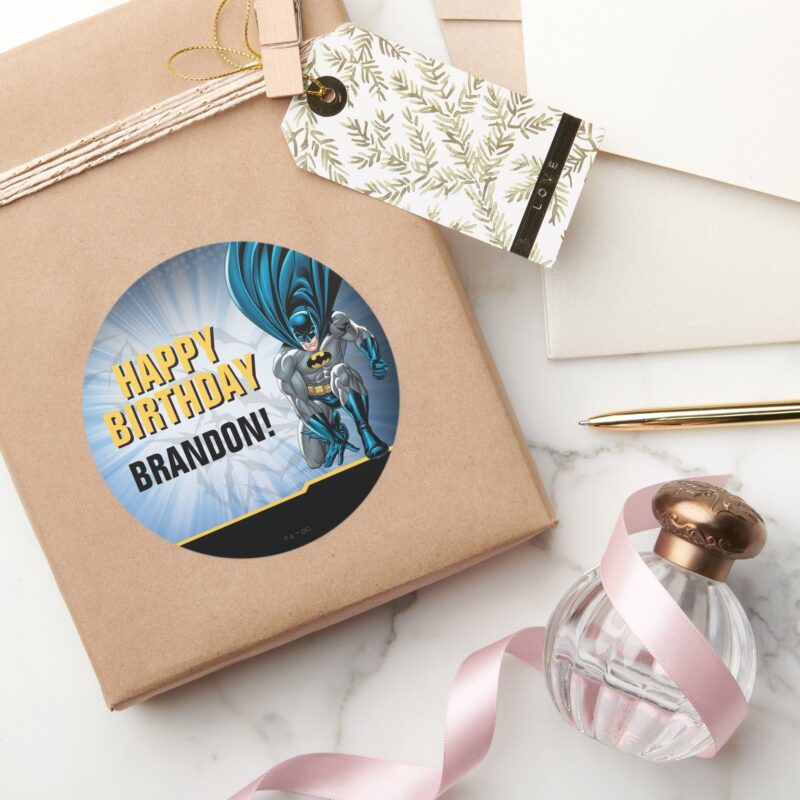 Batman Happy Birthday Classic Round Sticker vinyl sticker, waterproof durable collectible sticker for laptop, phone, bottle, bike, notebook, helmet, and accessories.