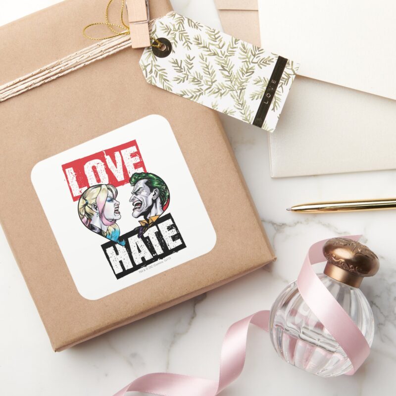 Batman Harley Quinn Joker Love Hate Square Sticker vinyl sticker, waterproof durable collectible sticker for laptop, phone, bottle, bike, notebook, helmet, and accessories.