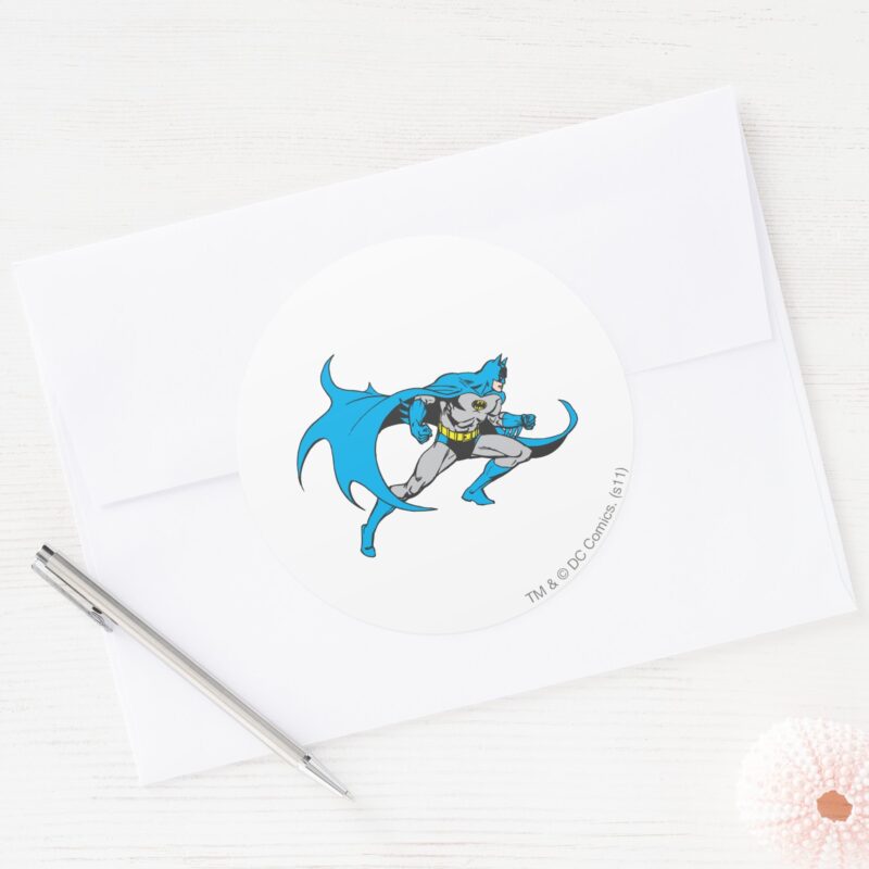 Batman Lunges Classic Round Sticker vinyl sticker, waterproof durable collectible sticker for laptop, phone, bottle, bike, notebook, helmet, and accessories.