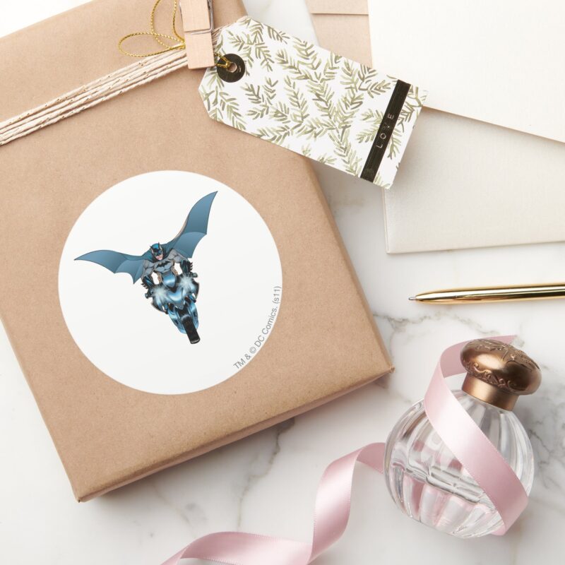 Batman On Bike With Cape Classic Round Sticker vinyl sticker, waterproof durable collectible sticker for laptop, phone, bottle, bike, notebook, helmet, and accessories.