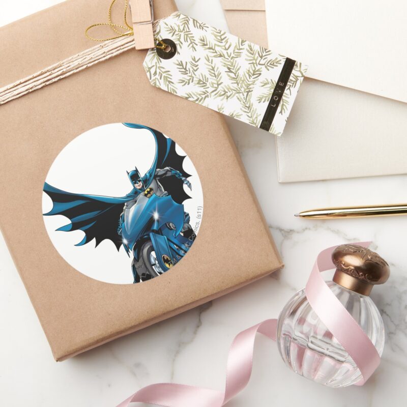 Batman On Cycle Classic Round Sticker vinyl sticker, waterproof durable collectible sticker for laptop, phone, bottle, bike, notebook, helmet, and accessories.