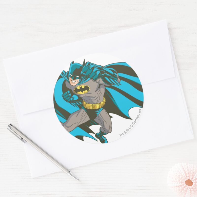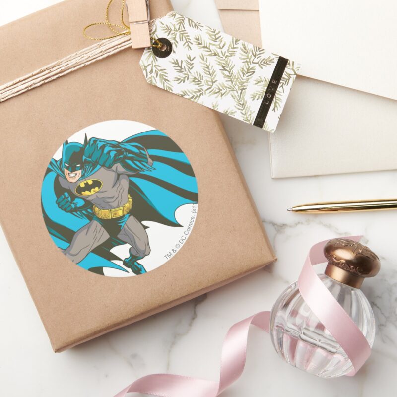 Batman Punching 1 Classic Round Sticker vinyl sticker, waterproof durable collectible sticker for laptop, phone, bottle, bike, notebook, helmet, and accessories.