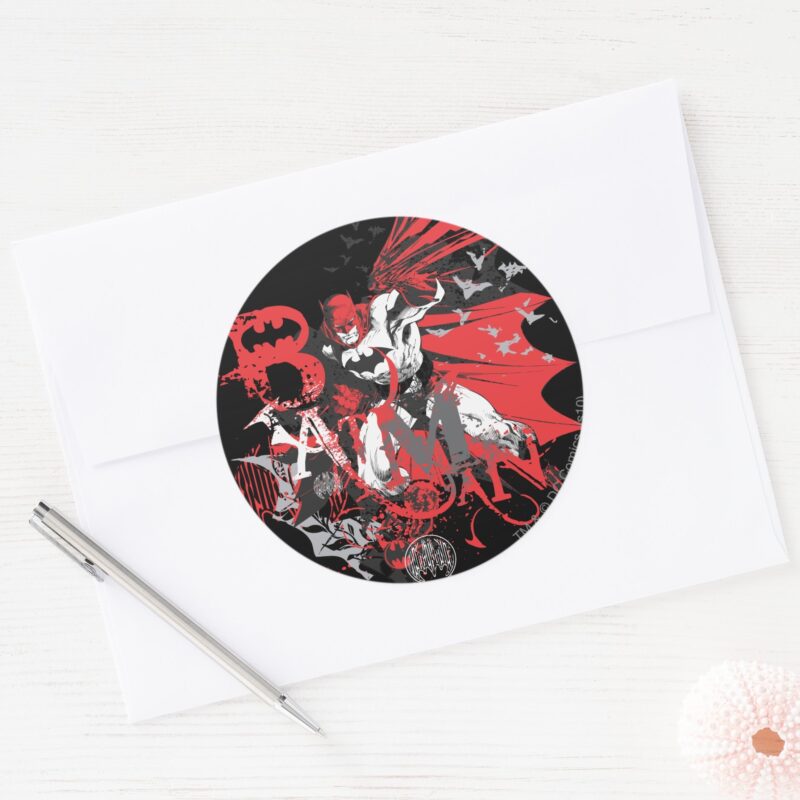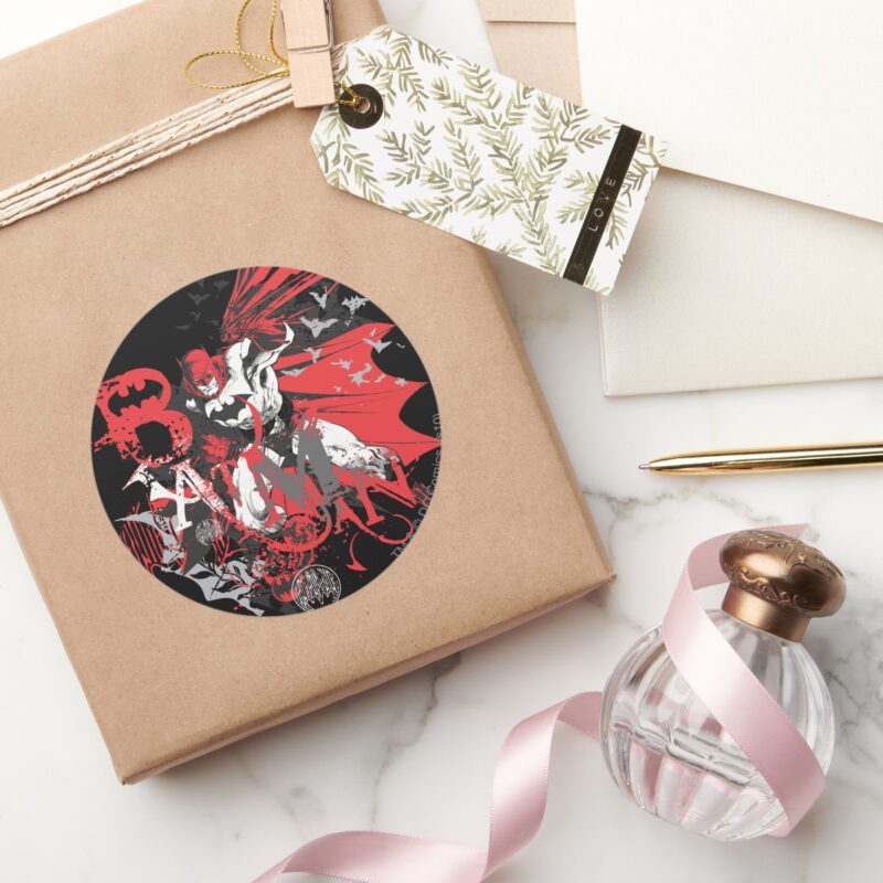 Batman Red And Black Collage Classic Round Sticker vinyl sticker, waterproof durable collectible sticker for laptop, phone, bottle, bike, notebook, helmet, and accessories.