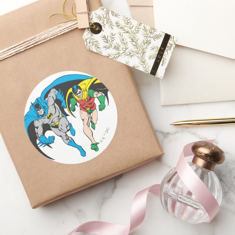 Batman Robin Classic Round Sticker vinyl sticker, waterproof durable collectible sticker for laptop, phone, bottle, bike, notebook, helmet, and accessories.