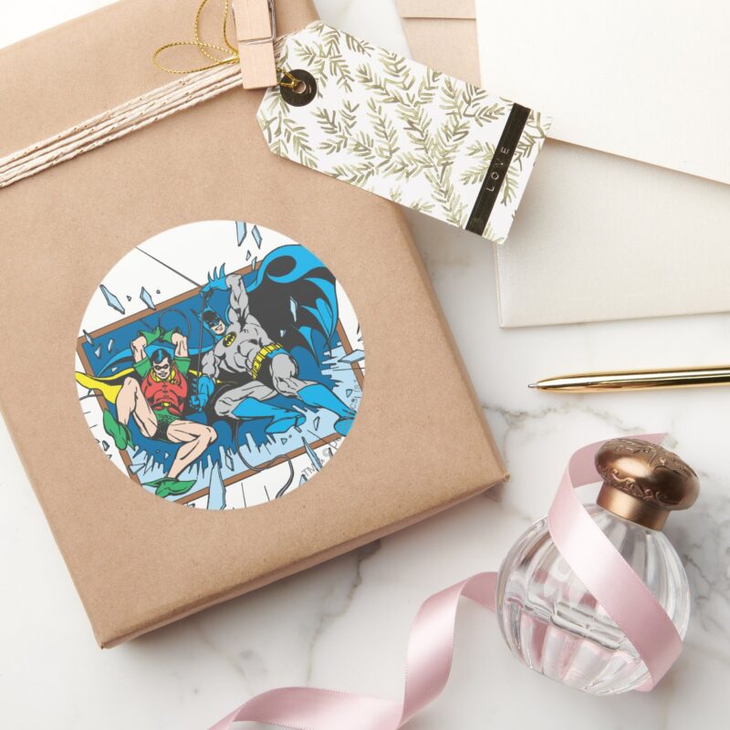 Batman Robin Shatter Window Classic Round Sticker vinyl sticker, waterproof durable collectible sticker for laptop, phone, bottle, bike, notebook, helmet, and accessories.