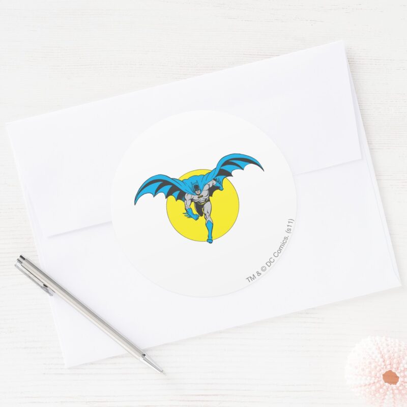 Batman Runs Forward Classic Round Sticker vinyl sticker, waterproof durable collectible sticker for laptop, phone, bottle, bike, notebook, helmet, and accessories.