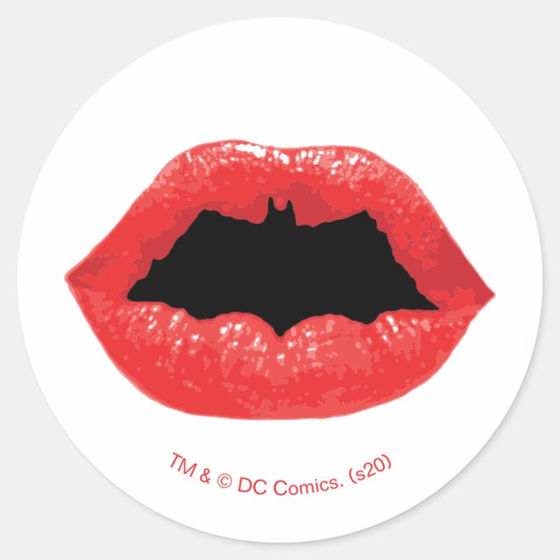 Batman Valentine Bat Lips Classic Round Sticker vinyl sticker, waterproof durable collectible sticker for laptop, phone, bottle, bike, notebook, helmet, and accessories.