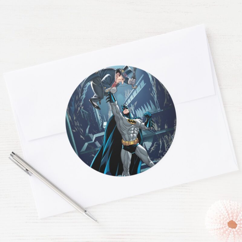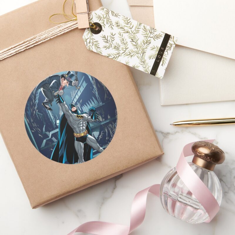 Batman Vs. Penguin Classic Round Sticker vinyl sticker, waterproof durable collectible sticker for laptop, phone, bottle, bike, notebook, helmet, and accessories.