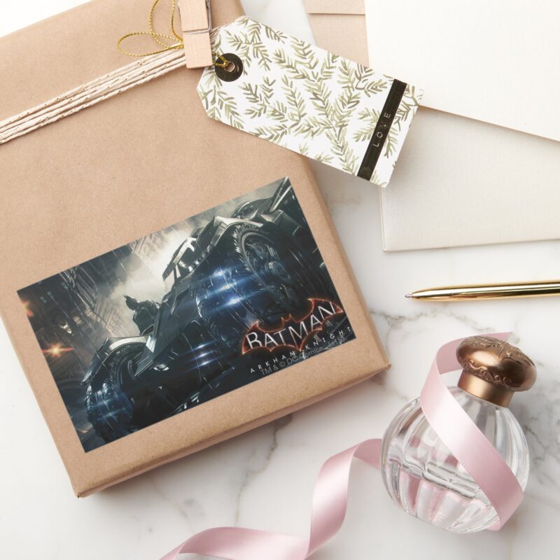 Batman With Batmobile In The Rain Rectangular Sticker vinyl sticker, waterproof durable collectible sticker for laptop, phone, bottle, bike, notebook, helmet, and accessories.