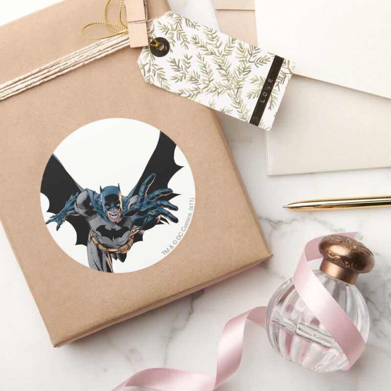 Batman Yells And Lunges Classic Round Sticker vinyl sticker, waterproof durable collectible sticker for laptop, phone, bottle, bike, notebook, helmet, and accessories.
