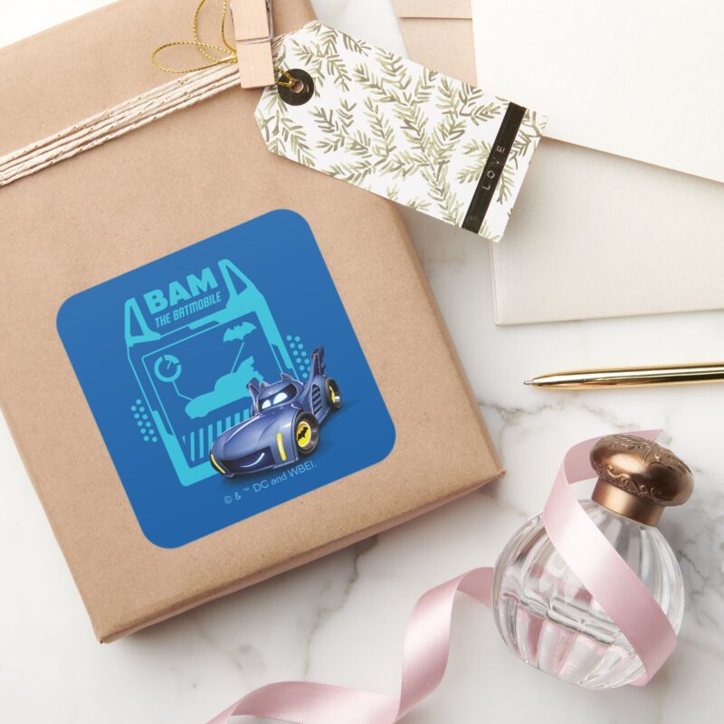 Batwheels™ Bam The Batmobile Square Sticker vinyl sticker, waterproof durable collectible sticker for laptop, phone, bottle, bike, notebook, helmet, and accessories.