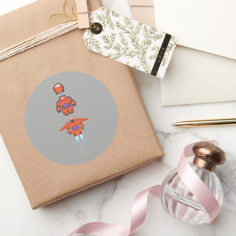 Baymax Orange Super Suit Classic Round Sticker vinyl sticker, waterproof durable collectible sticker for laptop, phone, bottle, bike, notebook, helmet, and accessories.