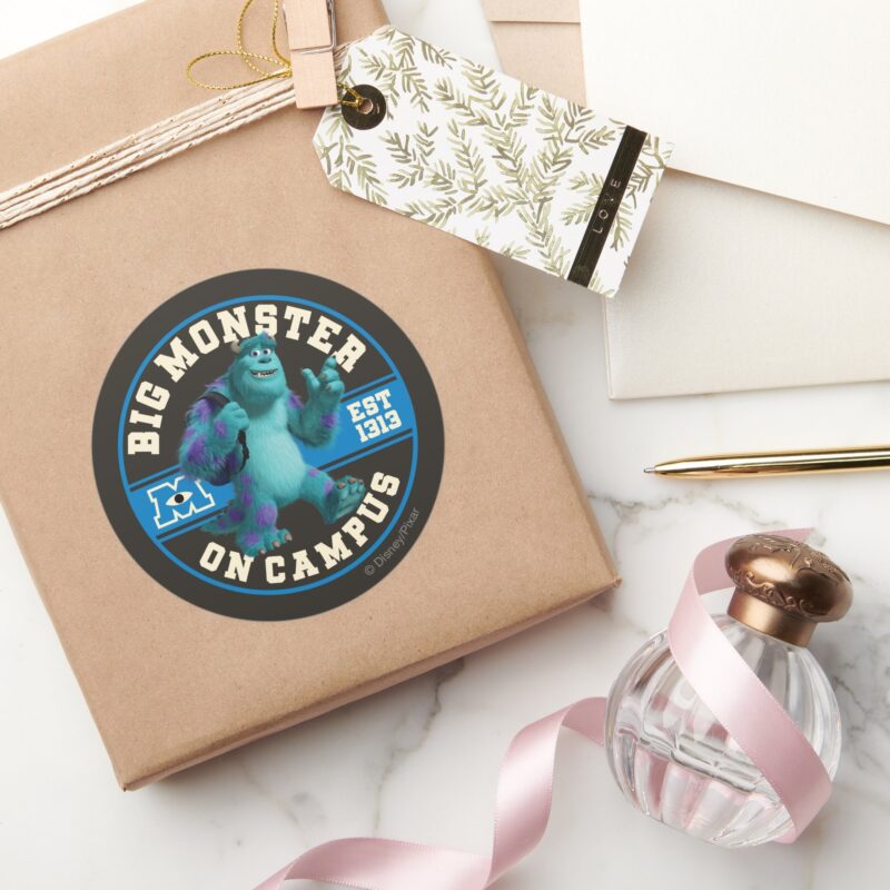 Big Monster On Campus Classic Round Sticker vinyl sticker, waterproof durable collectible sticker for laptop, phone, bottle, bike, notebook, helmet, and accessories.