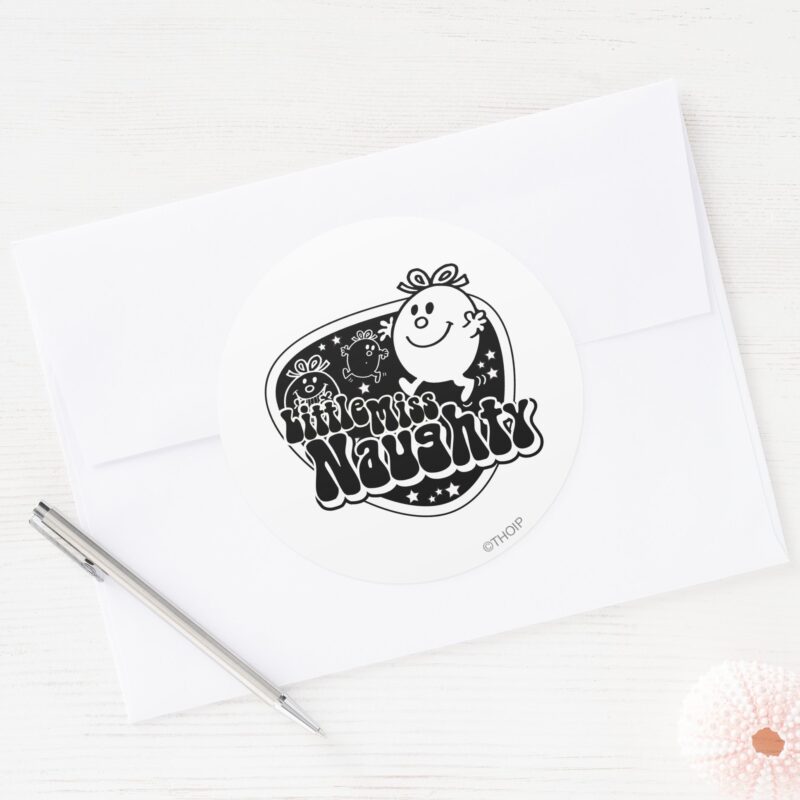 Black White Little Miss Naughty Classic Round Sticker vinyl sticker, waterproof durable collectible sticker for laptop, phone, bottle, bike, notebook, helmet, and accessories.