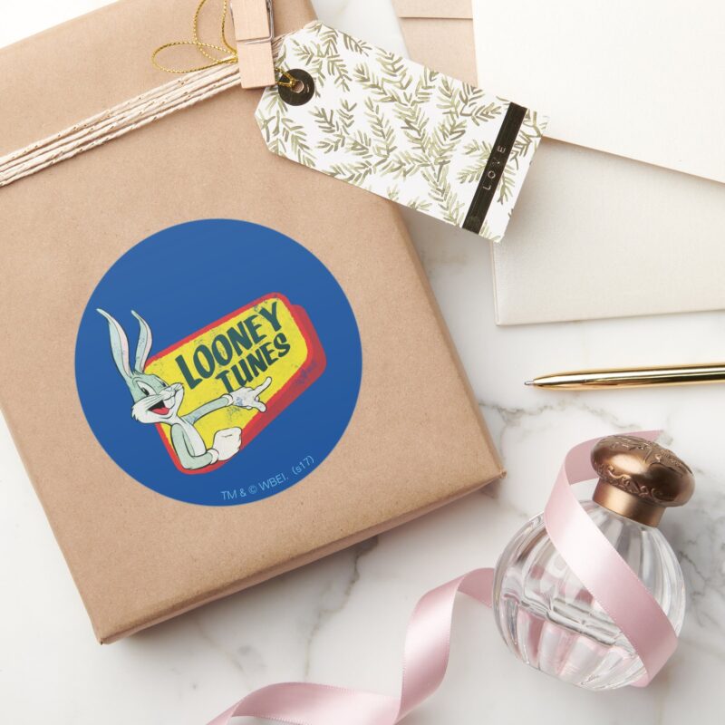BUGS BUNNY™ LOONEY TUNES™ Retro Patch Classic Round Sticker vinyl sticker, waterproof durable collectible sticker for laptop, phone, bottle, bike, notebook, helmet, and accessories.