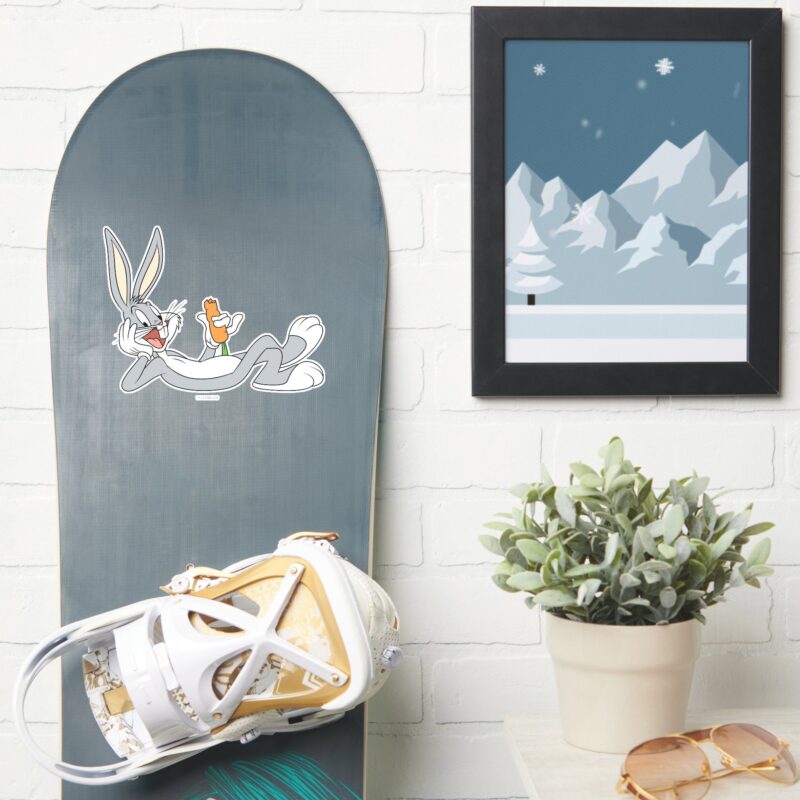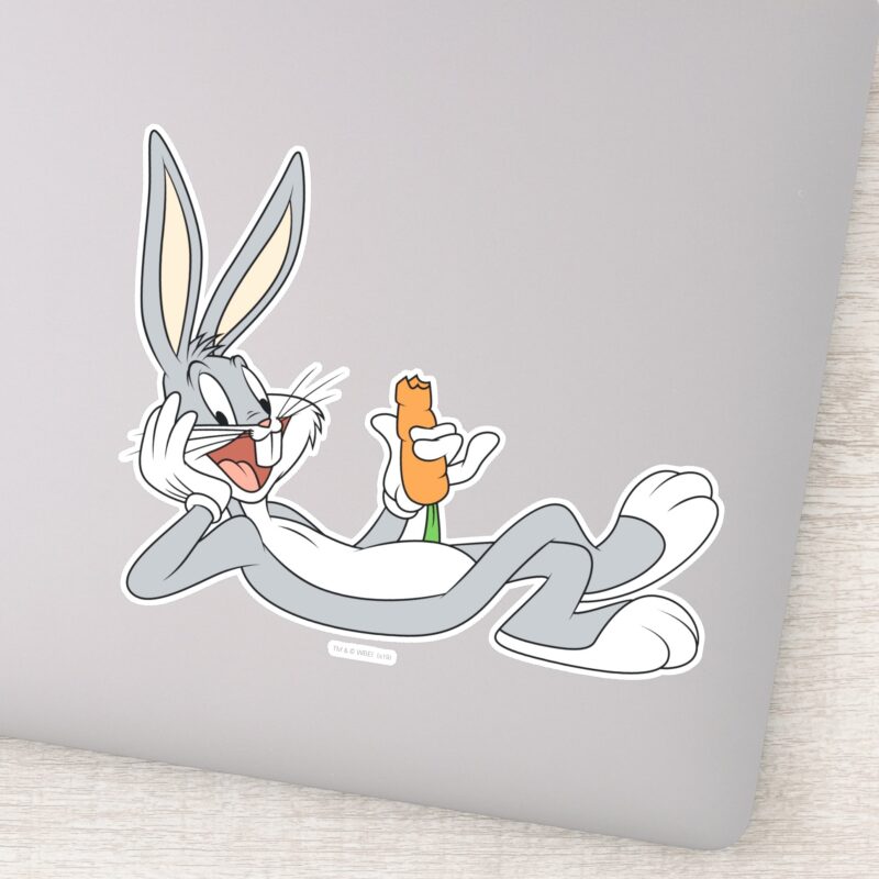 BUGS BUNNY™ Lying Down Eating Carrot Sticker vinyl sticker, waterproof durable collectible sticker for laptop, phone, bottle, bike, notebook, helmet, and accessories.