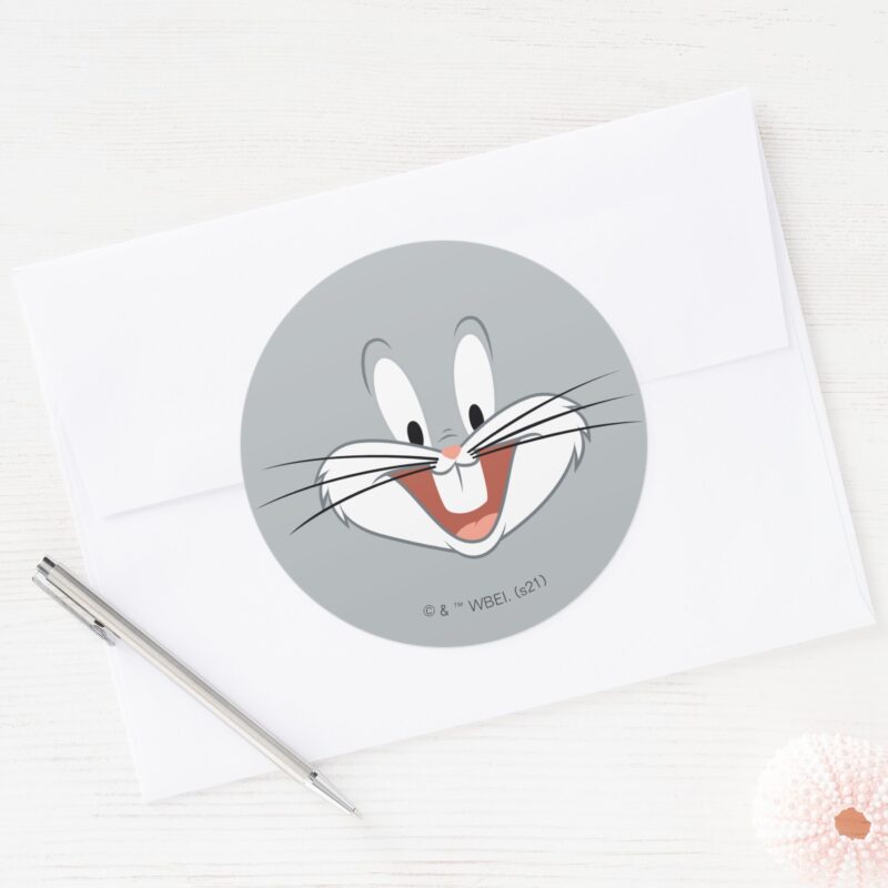 BUGS BUNNY™ Smile Classic Round Sticker vinyl sticker, waterproof durable collectible sticker for laptop, phone, bottle, bike, notebook, helmet, and accessories.