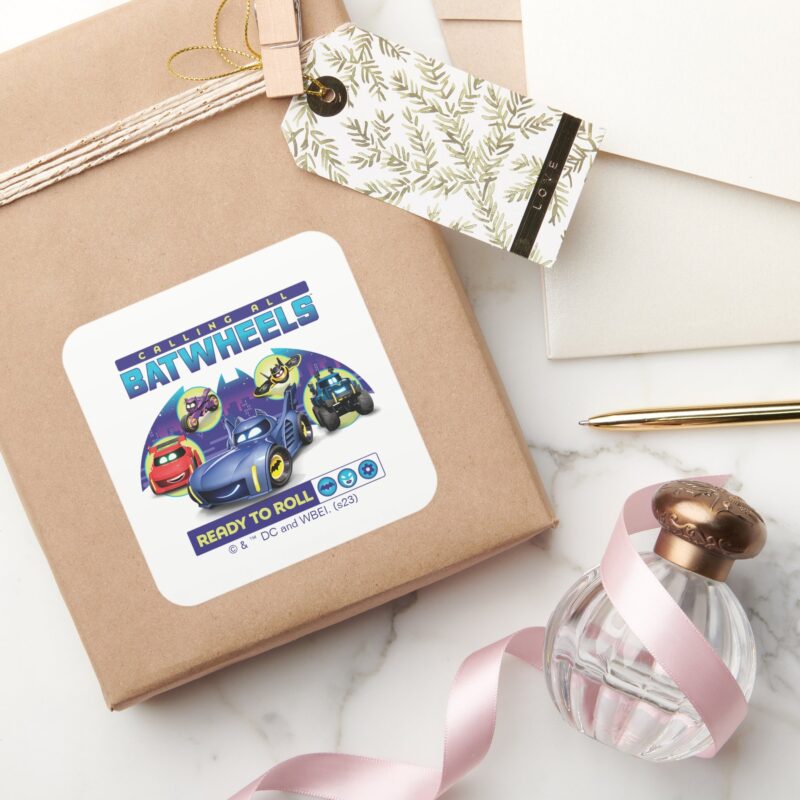 Calling All Batwheels™ Ready To Roll Square Sticker vinyl sticker, waterproof durable collectible sticker for laptop, phone, bottle, bike, notebook, helmet, and accessories.