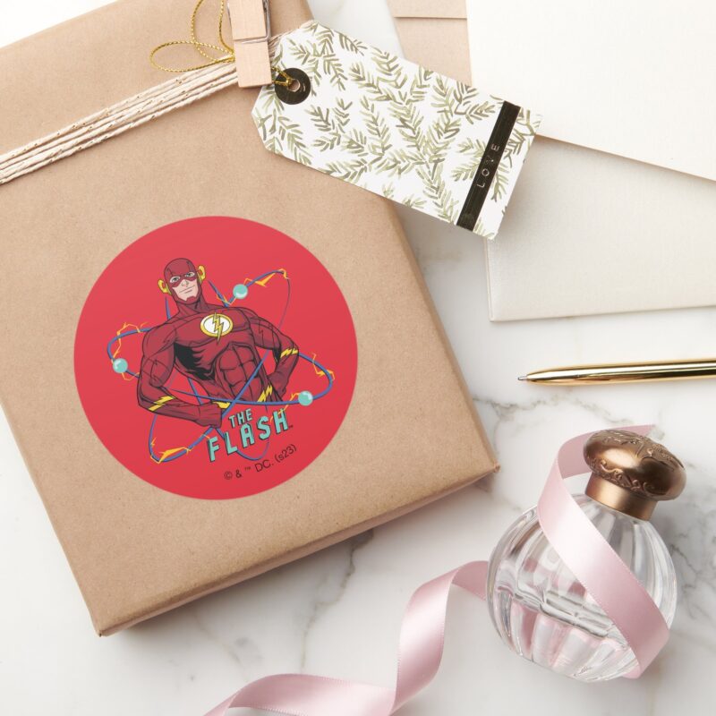 Cartoon Flash Atomic Graphic Classic Round Sticker vinyl sticker, waterproof durable collectible sticker for laptop, phone, bottle, bike, notebook, helmet, and accessories.