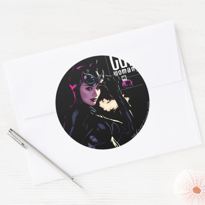 Catwoman Classic Round Sticker vinyl sticker, waterproof durable collectible sticker for laptop, phone, bottle, bike, notebook, helmet, and accessories.
