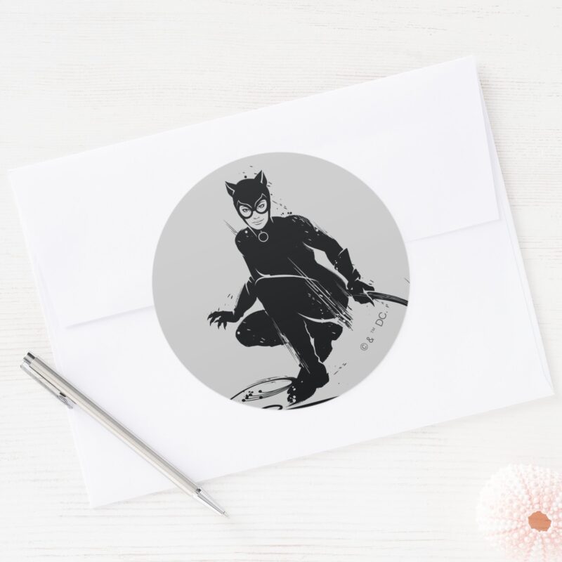 Catwoman Ink Brush Pose Classic Round Sticker vinyl sticker, waterproof durable collectible sticker for laptop, phone, bottle, bike, notebook, helmet, and accessories.