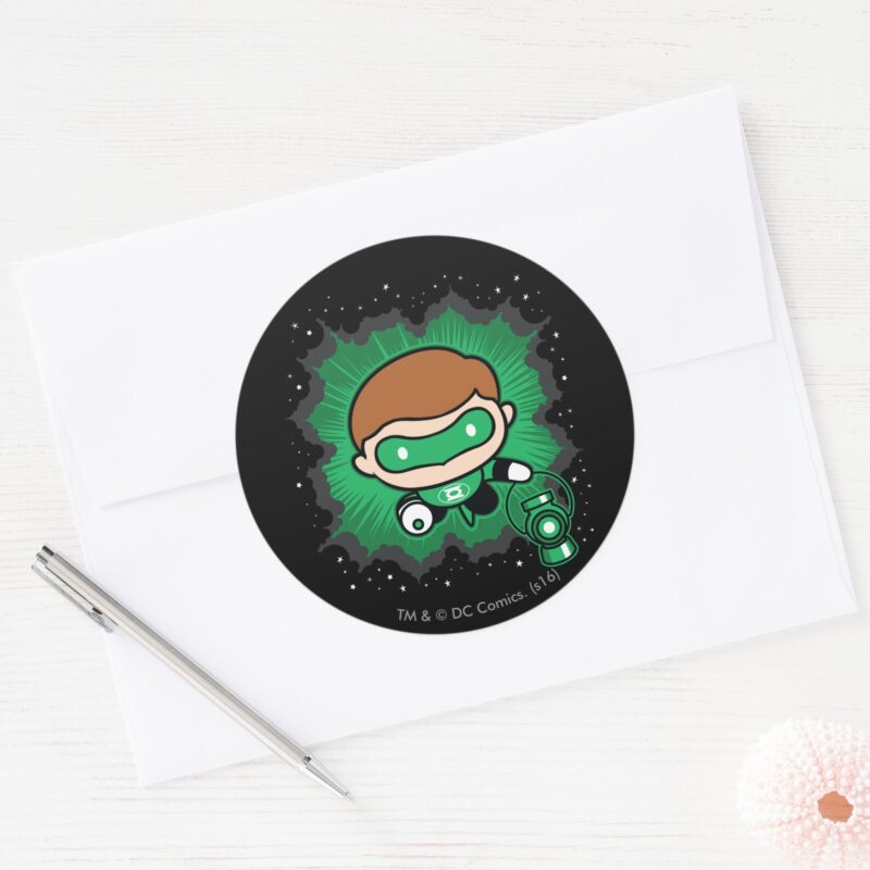 Chibi Green Lantern Flying Through Space Classic Round Sticker vinyl sticker, waterproof durable collectible sticker for laptop, phone, bottle, bike, notebook, helmet, and accessories.