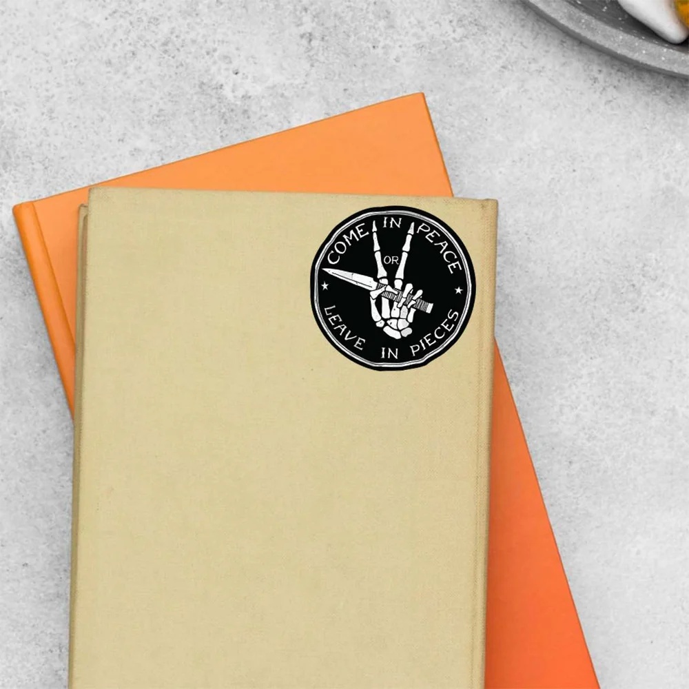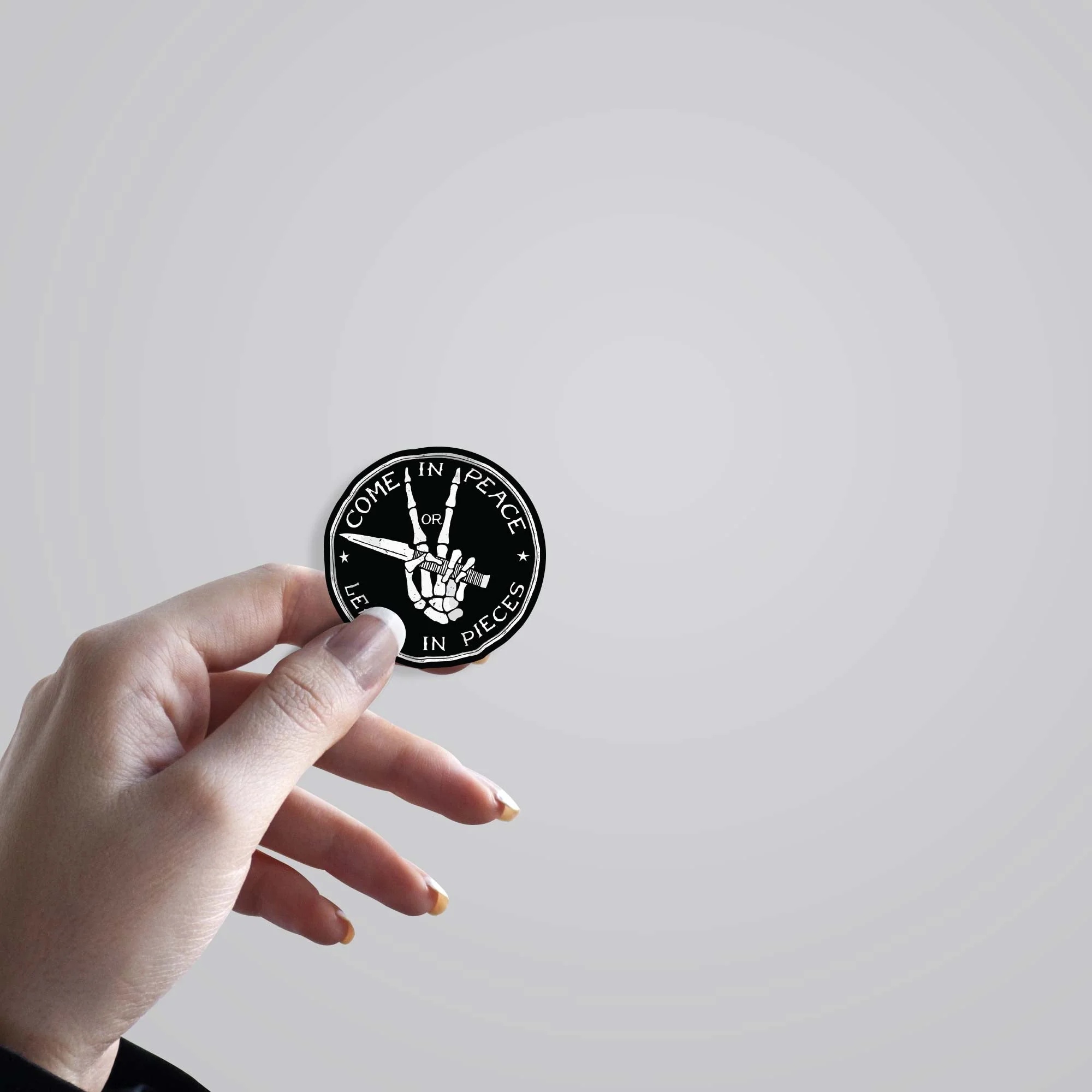 Come In Peace Or Leave In Pieces Witty Stickers vinyl sticker, waterproof durable collectible sticker for laptop, phone, bottle, bike, notebook, helmet, and accessories.