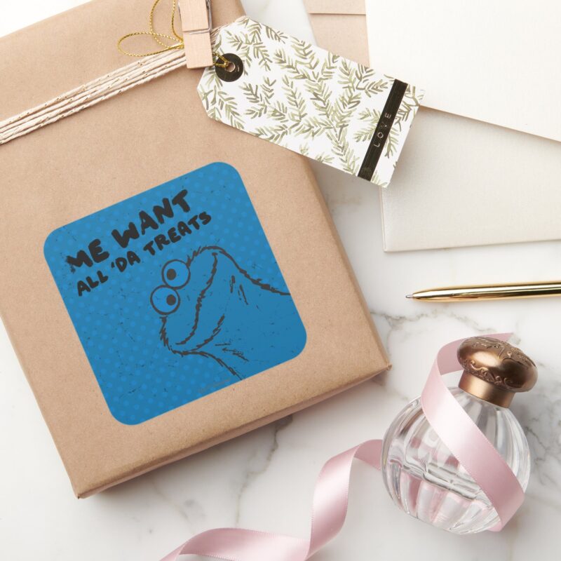 Cookie Monster All Da Treats Square Sticker vinyl sticker, waterproof durable collectible sticker for laptop, phone, bottle, bike, notebook, helmet, and accessories.