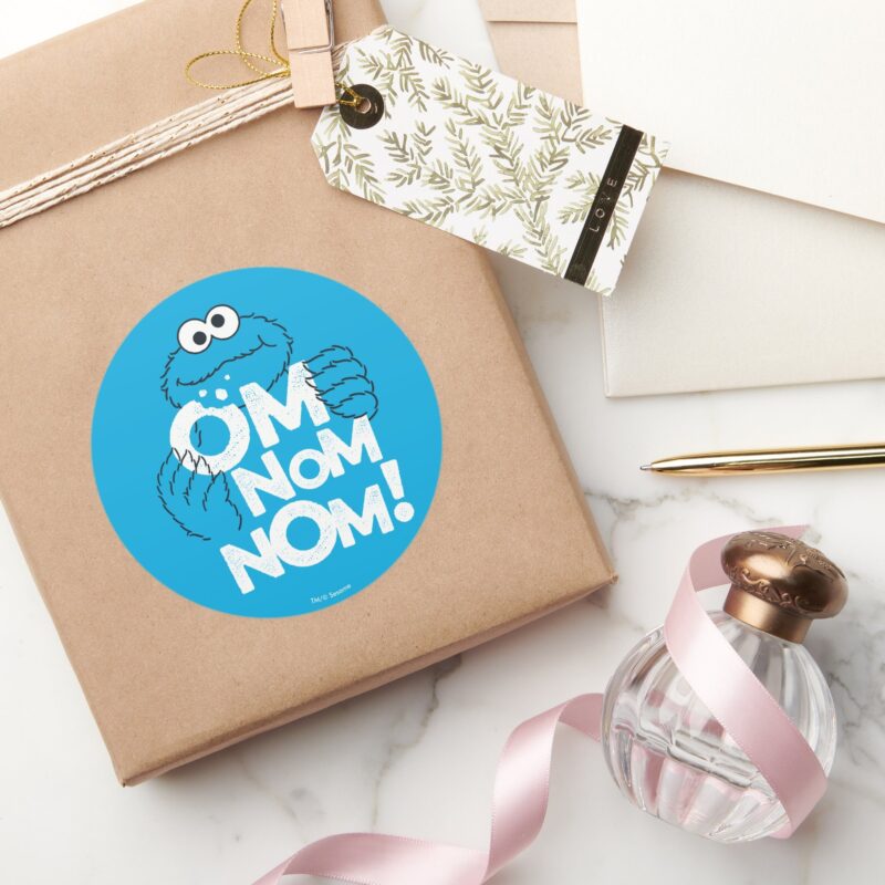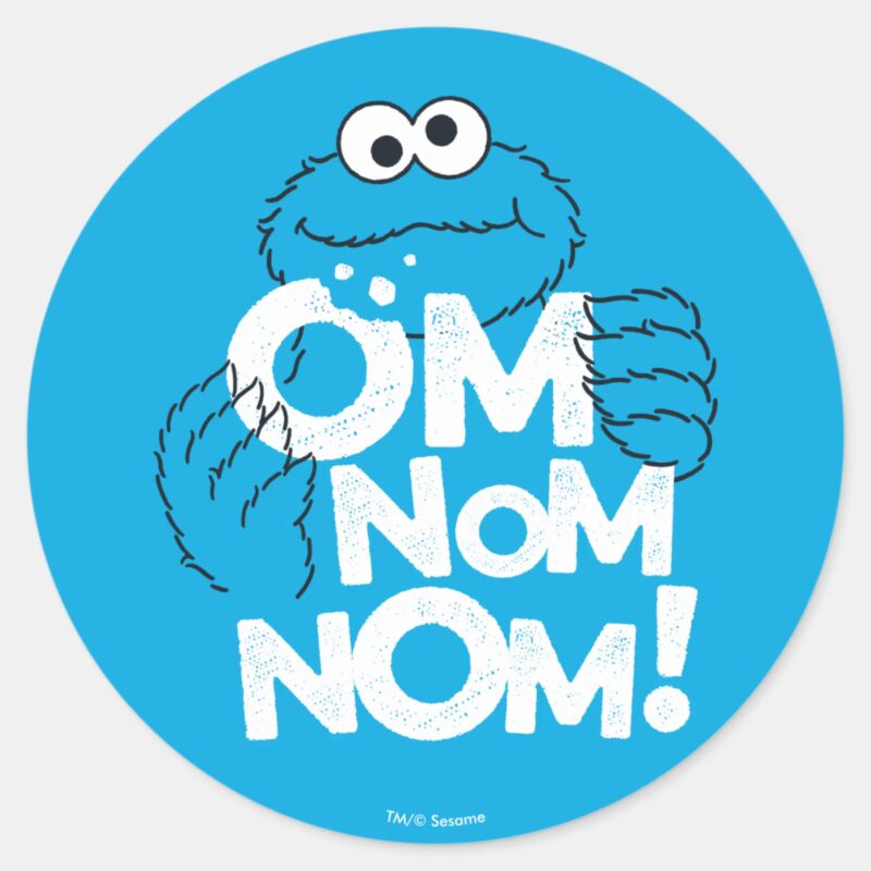 Cookie Monster Om Nom Nom Classic Round Sticker vinyl sticker, waterproof durable collectible sticker for laptop, phone, bottle, bike, notebook, helmet, and accessories.