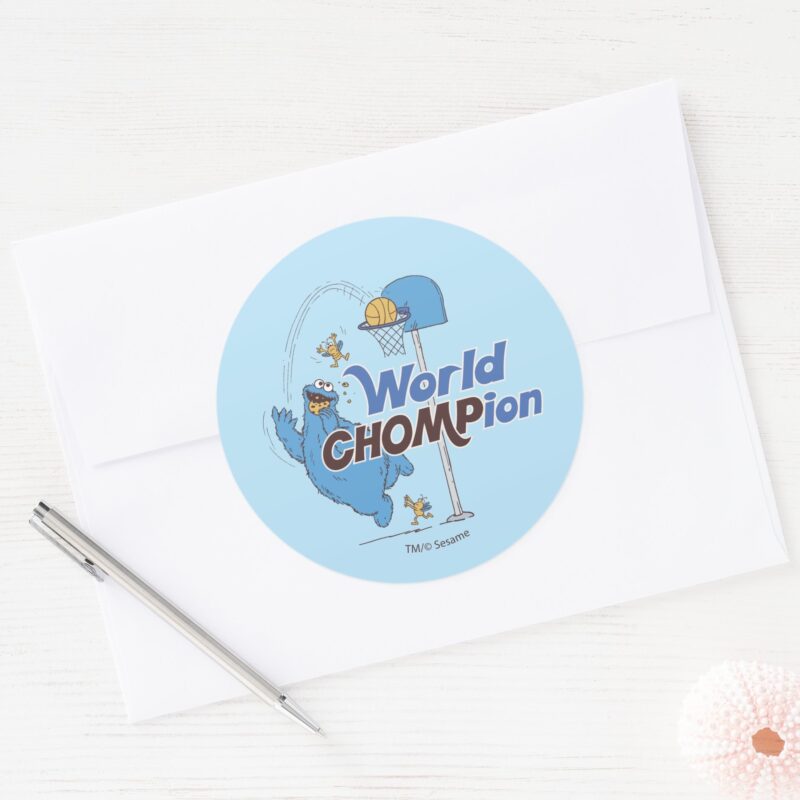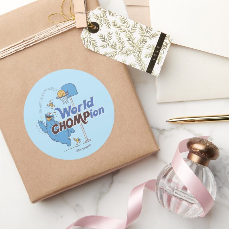 Cookie Monster Shooting Basketball Hoops Classic Round Sticker vinyl sticker, waterproof durable collectible sticker for laptop, phone, bottle, bike, notebook, helmet, and accessories.