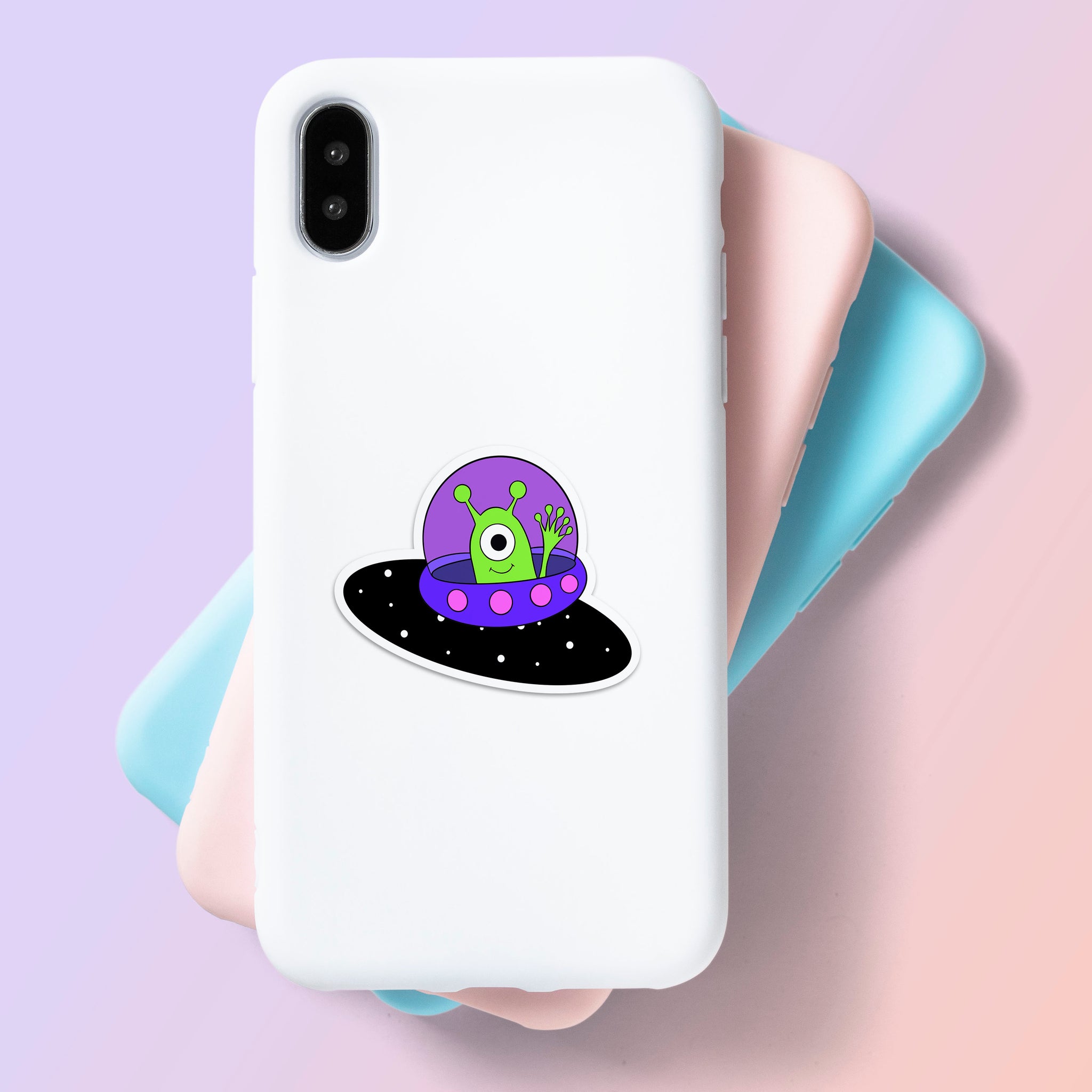 Cute Alien In Spaceship Sticker vinyl sticker, waterproof durable collectible sticker for laptop, phone, bottle, bike, notebook, helmet, and accessories.