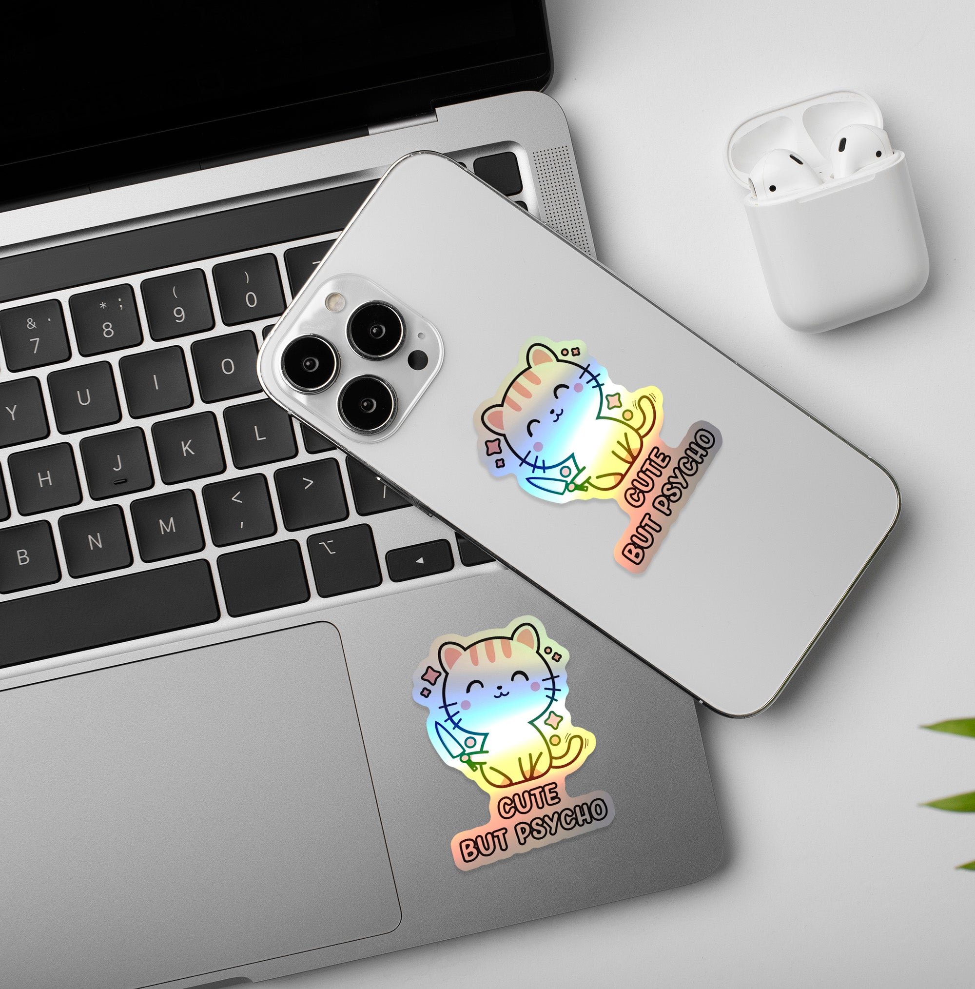 Cute But Psycho Holographic Laptop Mobile Sticker vinyl sticker, waterproof durable collectible sticker for laptop, phone, bottle, bike, notebook, helmet, and accessories.