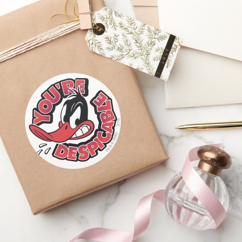 DAFFY DUCK™ Youre Despicable Classic Round Sticker vinyl sticker, waterproof durable collectible sticker for laptop, phone, bottle, bike, notebook, helmet, and accessories.