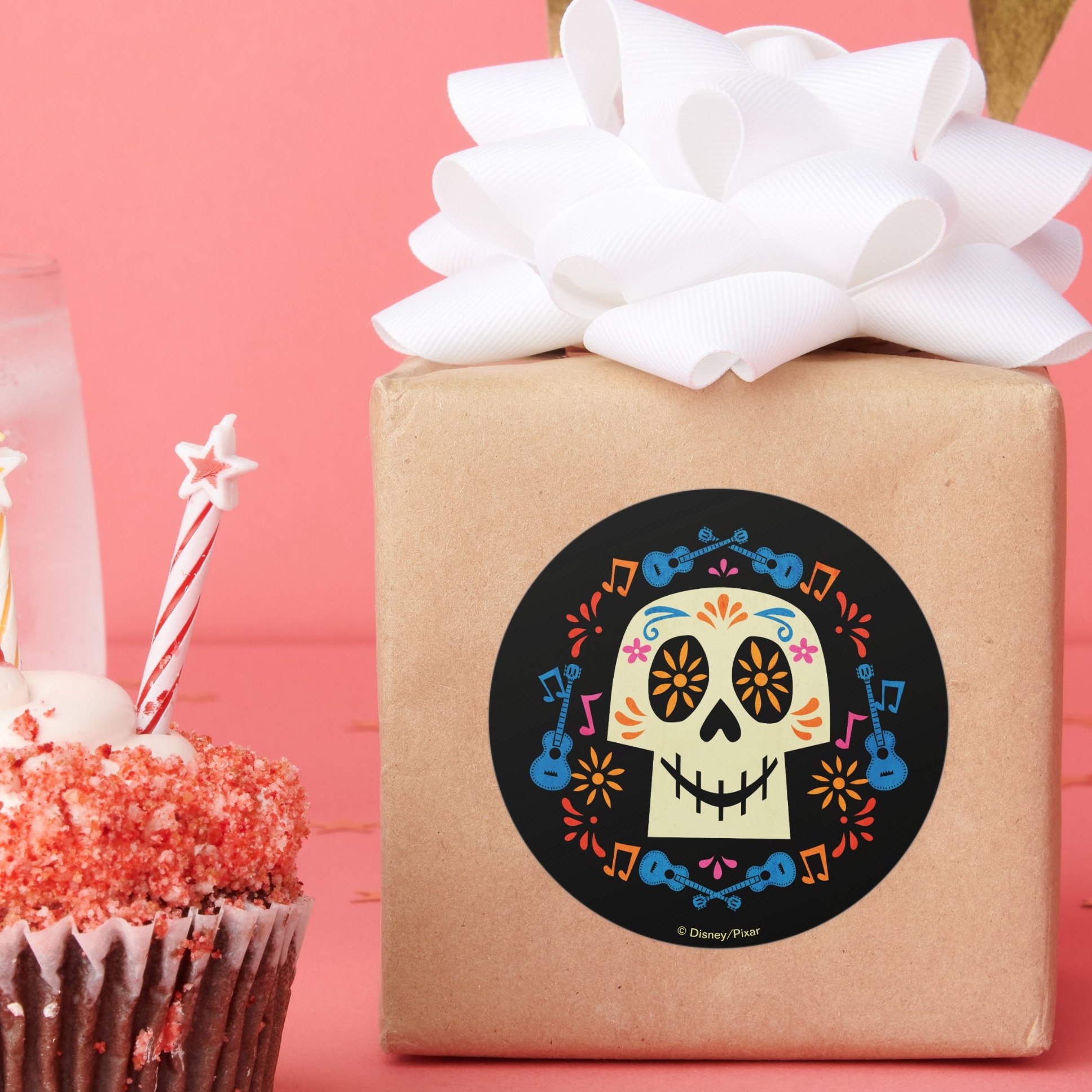 Disney Pixar Coco Gothic Sugar Skull Classic Round Sticker vinyl sticker, waterproof durable collectible sticker for laptop, phone, bottle, bike, notebook, helmet, and accessories.