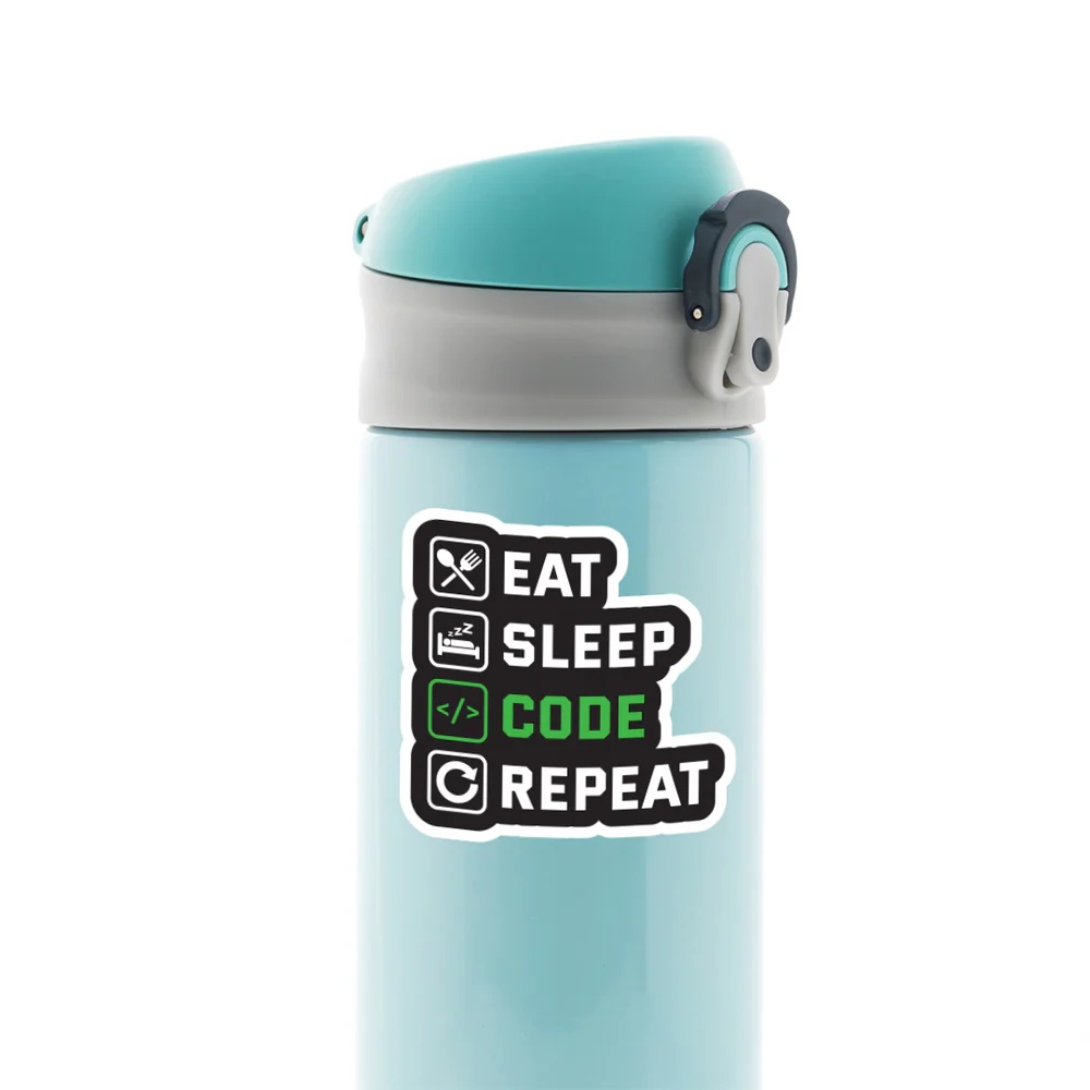 Eat Sleep Code Repeat Witty Stickers vinyl sticker, waterproof durable collectible sticker for laptop, phone, bottle, bike, notebook, helmet, and accessories.