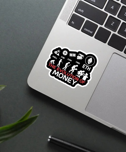 Evolution Of Money Sticker vinyl sticker, waterproof durable collectible sticker for laptop, phone, bottle, bike, notebook, helmet, and accessories.