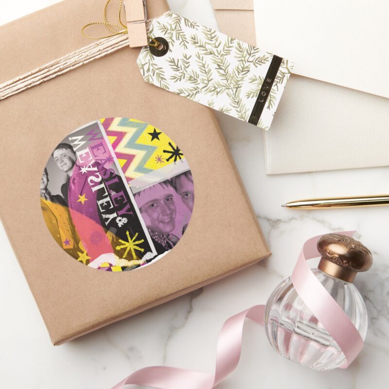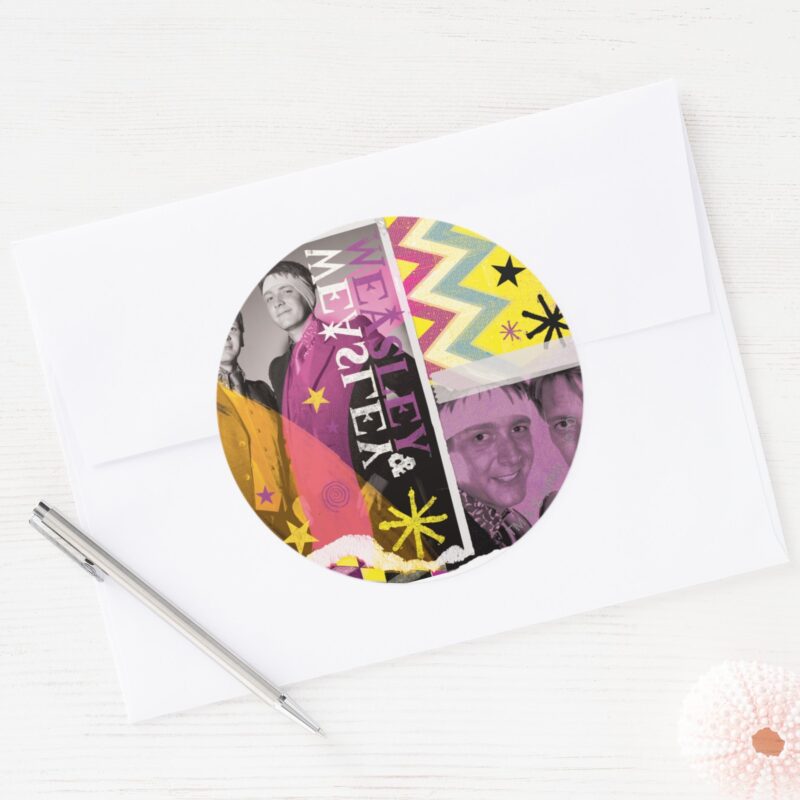 Fred And George Weasley Classic Round Sticker vinyl sticker, waterproof durable collectible sticker for laptop, phone, bottle, bike, notebook, helmet, and accessories.