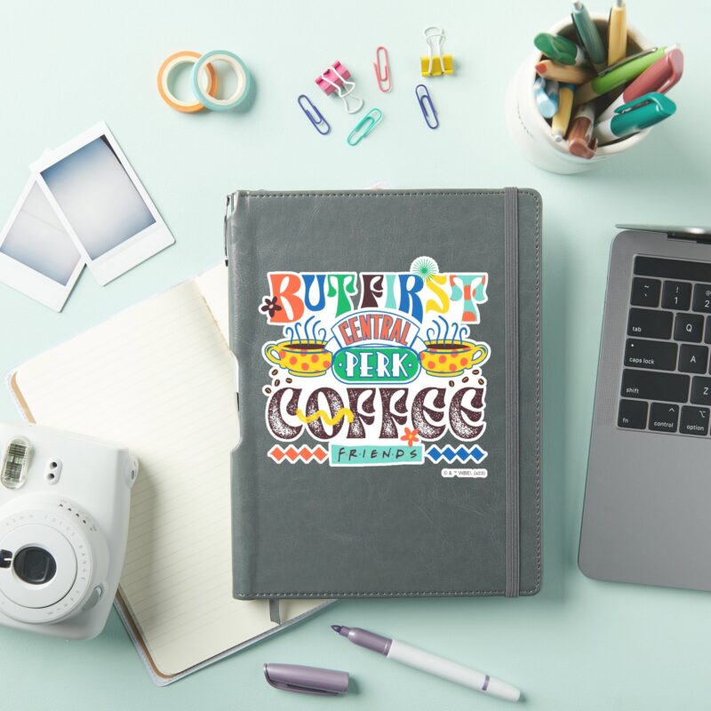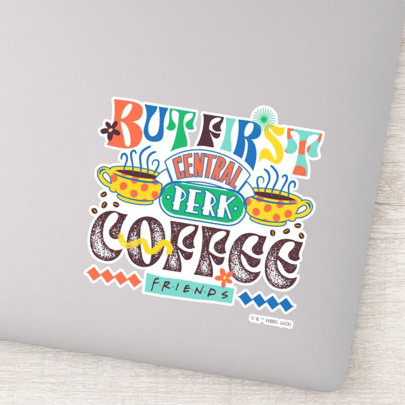 FRIENDS™ But First Coffee Vibrant Graphic Sticker vinyl sticker, waterproof durable collectible sticker for laptop, phone, bottle, bike, notebook, helmet, and accessories.
